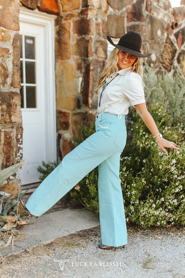 Stand out in every season with the Lucky & Blessed Western Wide-Leg Jeans in Mint! These turquoise high-waisted jeans offer a bold yet versatile statement. Featuring ivory whipstitch embroidery on the pockets and belt loops, these jeans exude authentic cowgirl charm with a playful twist. The relaxed wide-leg cut flatters every body type while offering all-day comfort and style.