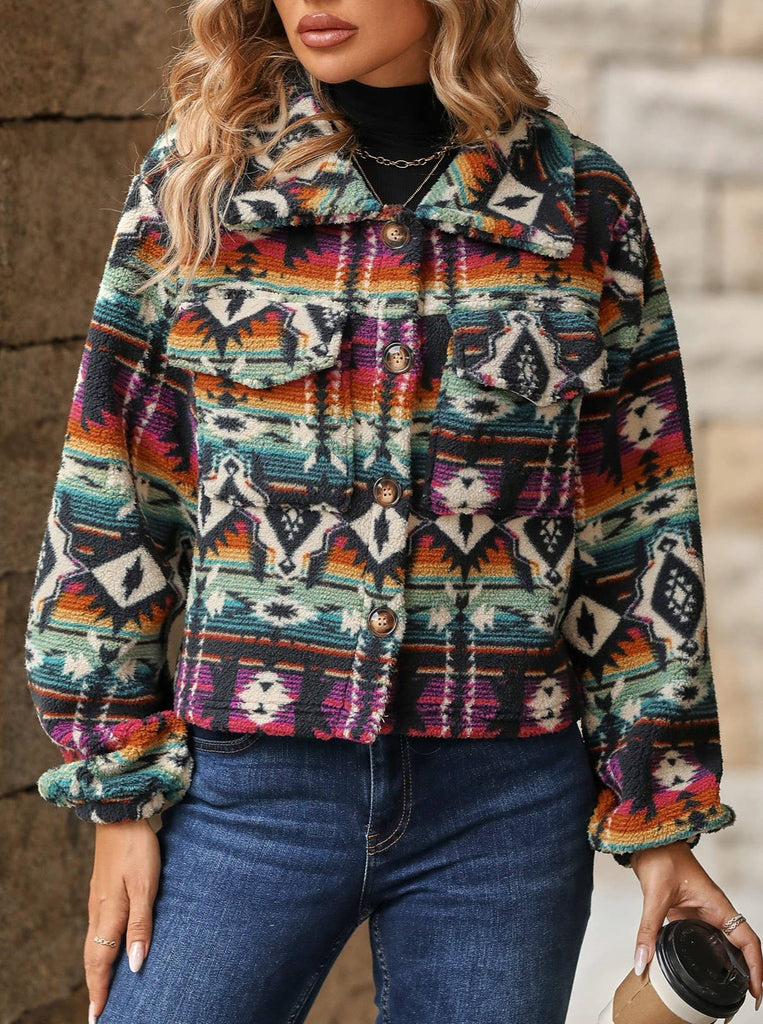 BUTTONED ETHNIC PRINT LONG-SLEEVED CROPPED JACKET